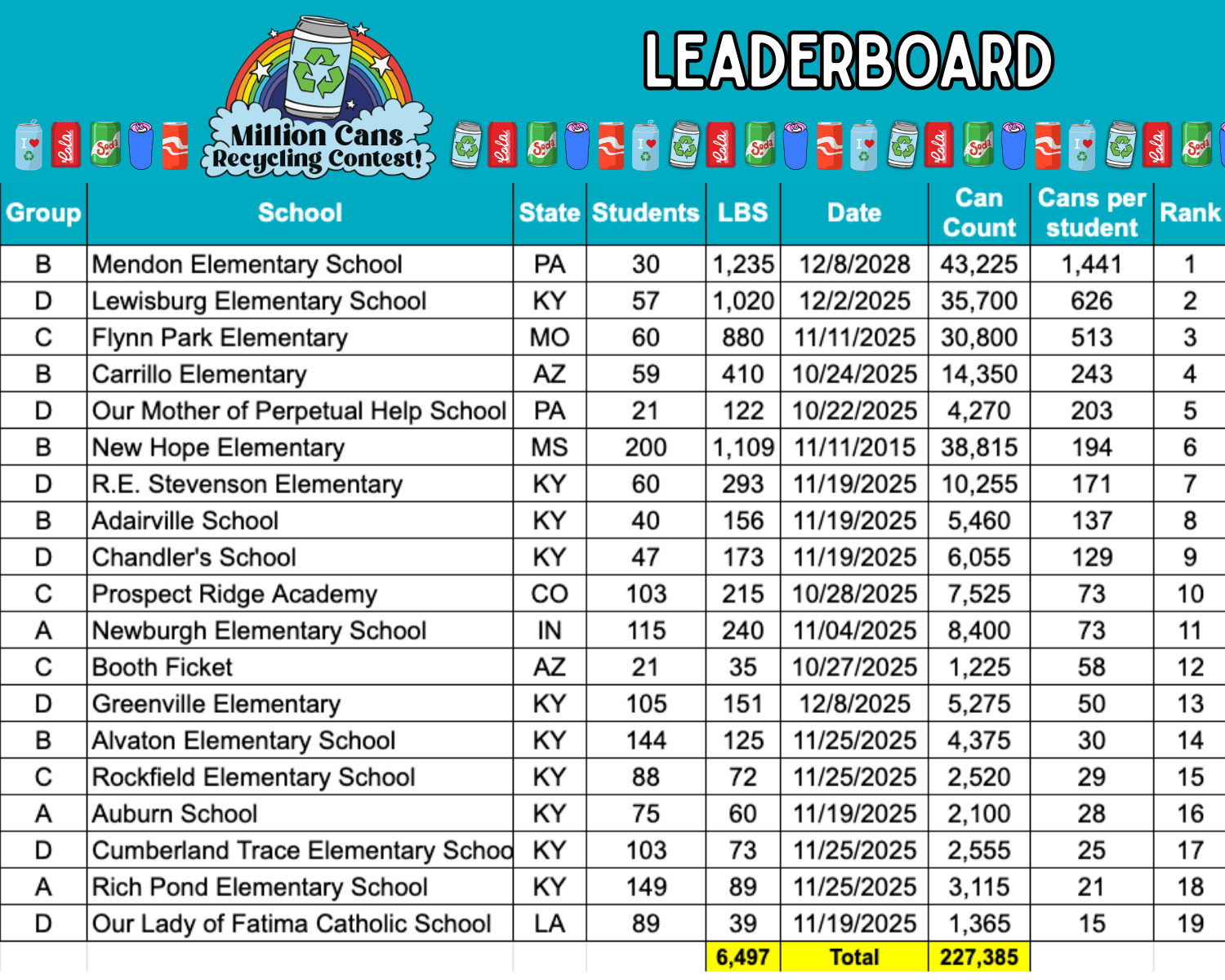 We launched the Million Cans Recycling Contest in November 2023 with just 8 incredible schools—and they recycled 1.3 million aluminum cans! In 2024, the contest grew to 36 schools and together they recycled over 2.2 million cans.