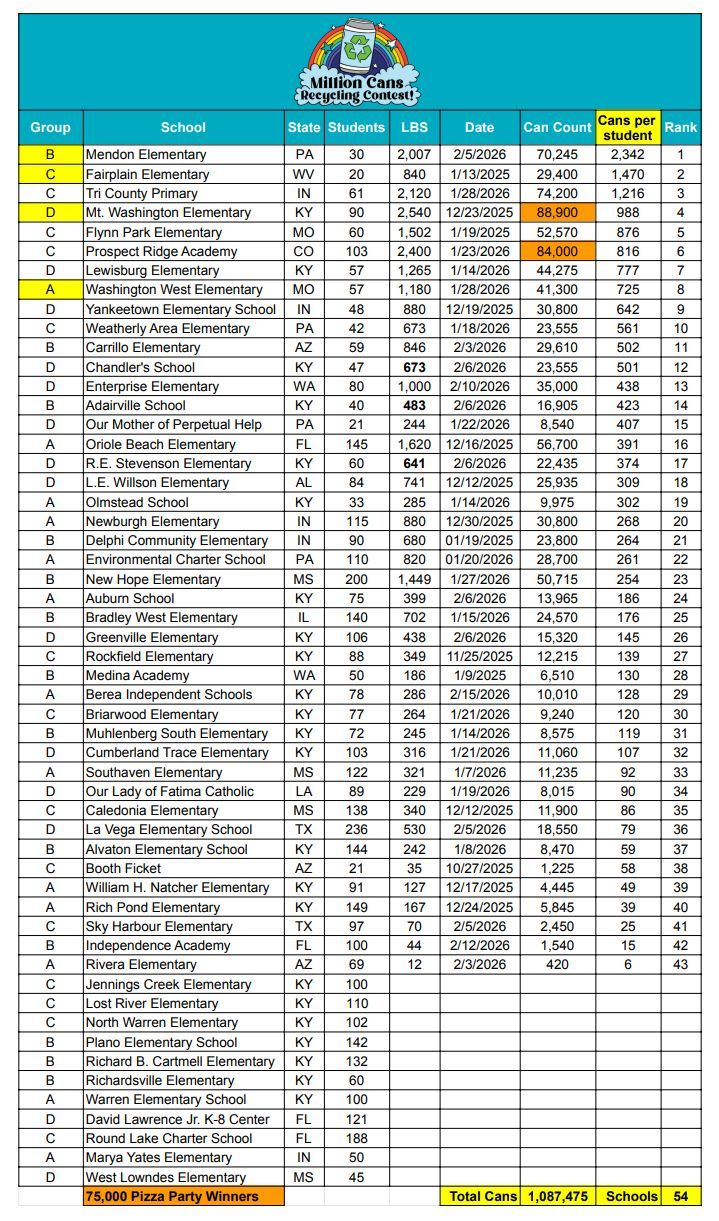 When a school reaches 75,000 recycled aluminum cans, their recycling superheroes earn a pizza party to celebrate their hard work and teamwork — and because they rallied their whole school and community to collect cans! It’s our way of saying THANK YOU for keeping cans out of the trash and helping protect our planet. Amazing job, superheroes — thanks a MILLION! 💚